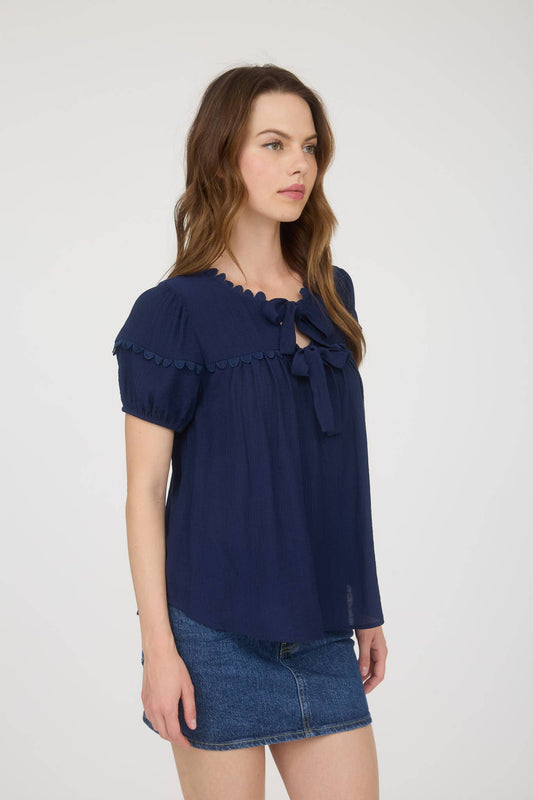 SCALLOP TRIM FRONT TIE DETAIL PUFF SLEEVE TOP: NAVY