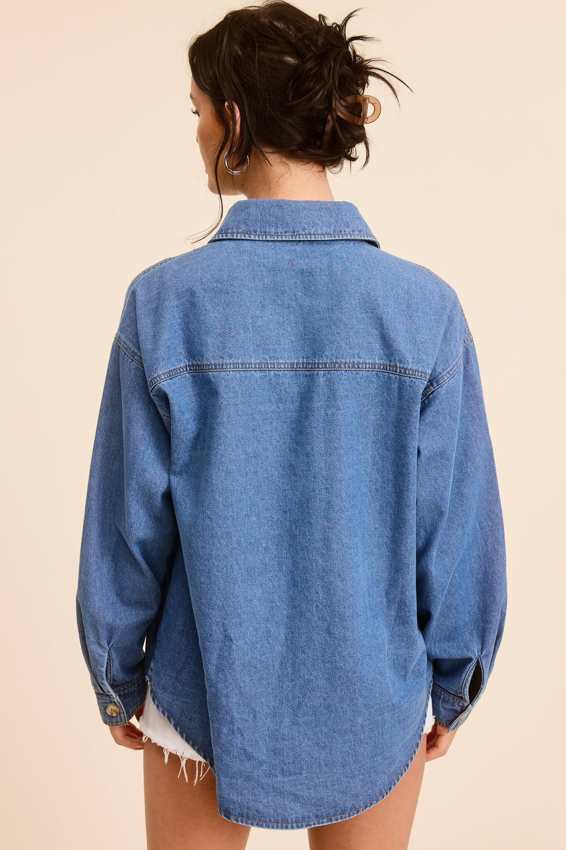 Collared denim button-down jacket top with contrast shadow front pockets, regular-length fit, and shirt tail hem, boho, classic, layering, , blue, denim jacket, year round, everyday casual