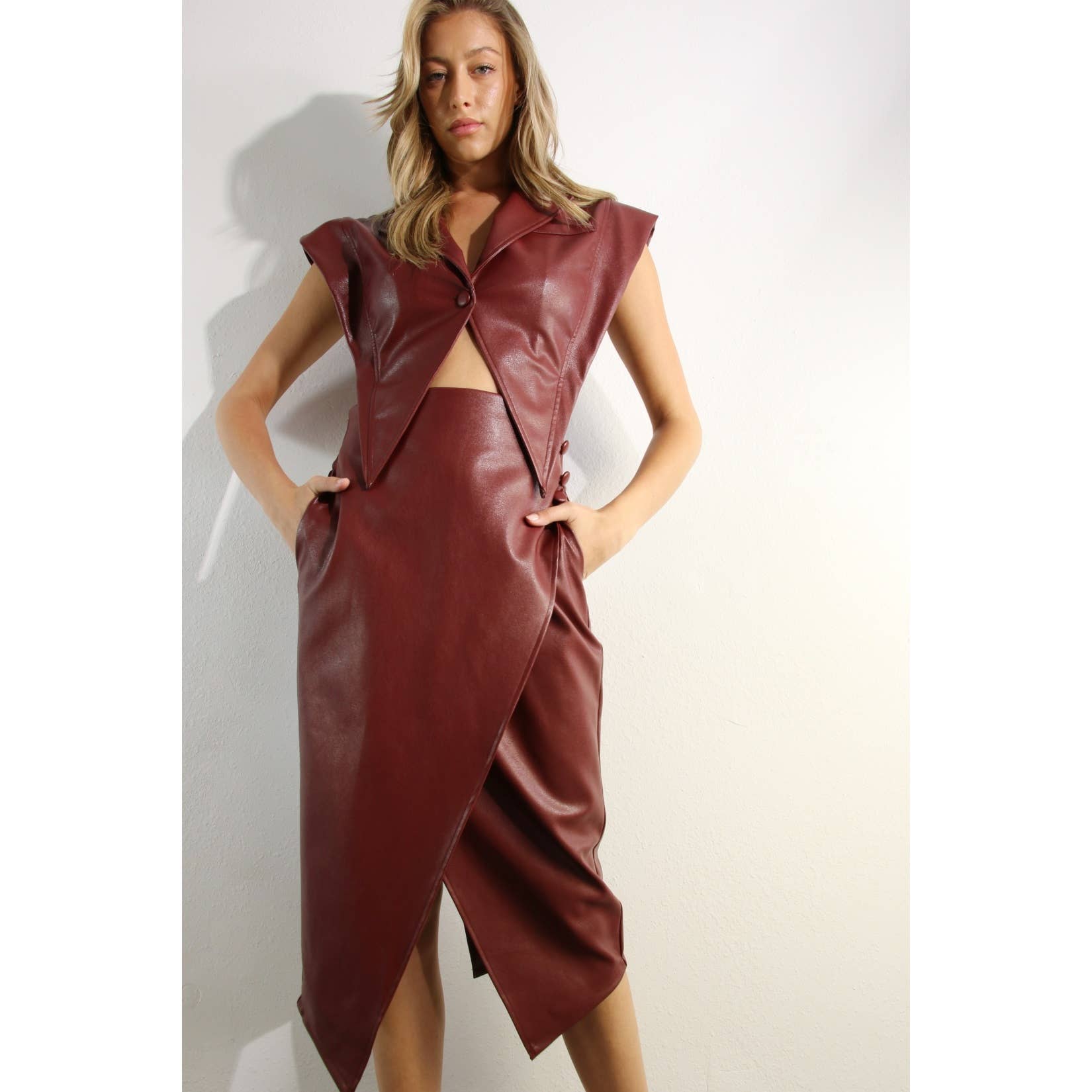 FAUX LEATHER VEST JACKET AND SKIRT SET