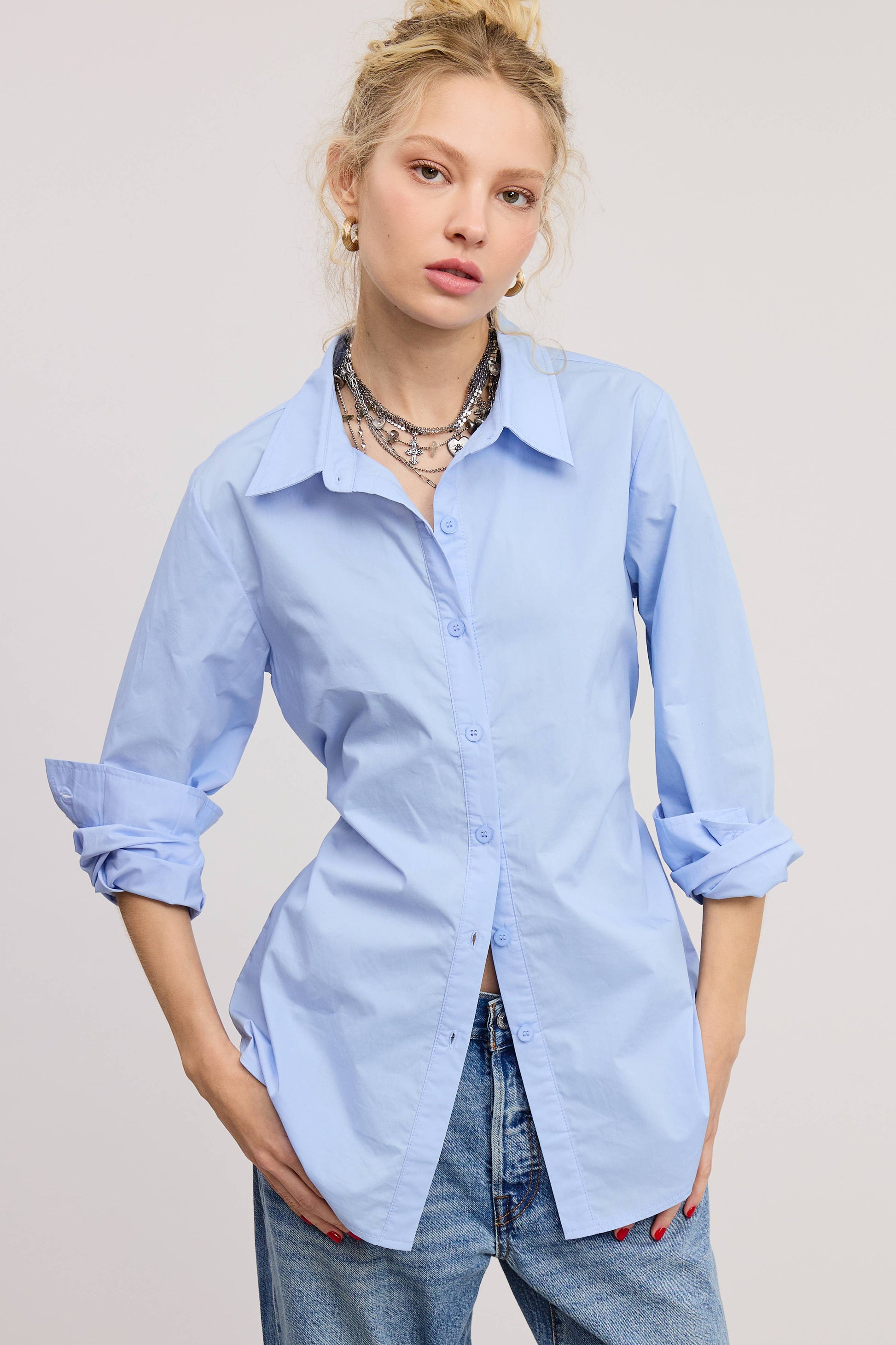 Fitted Collared Shirt Blouse with Back Self-Tie Detail Long-sleeve collared shirt blouse featuring a front button-down closure, fitted silhouette, and includes a self-tie ribbon detail at the back for added structure.
