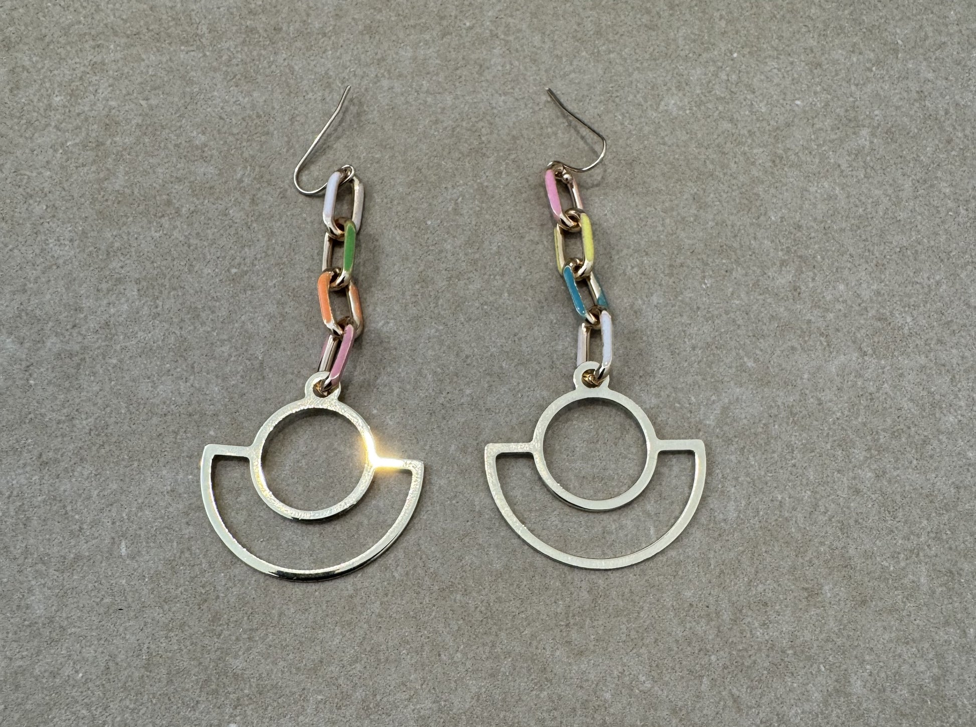 Bold meets playful in this modern pair featuring interlinked pastel-coated chain links and open half-moon brass charms. Lightweight yet eye-catching—an instant mood-booster for any outfit.