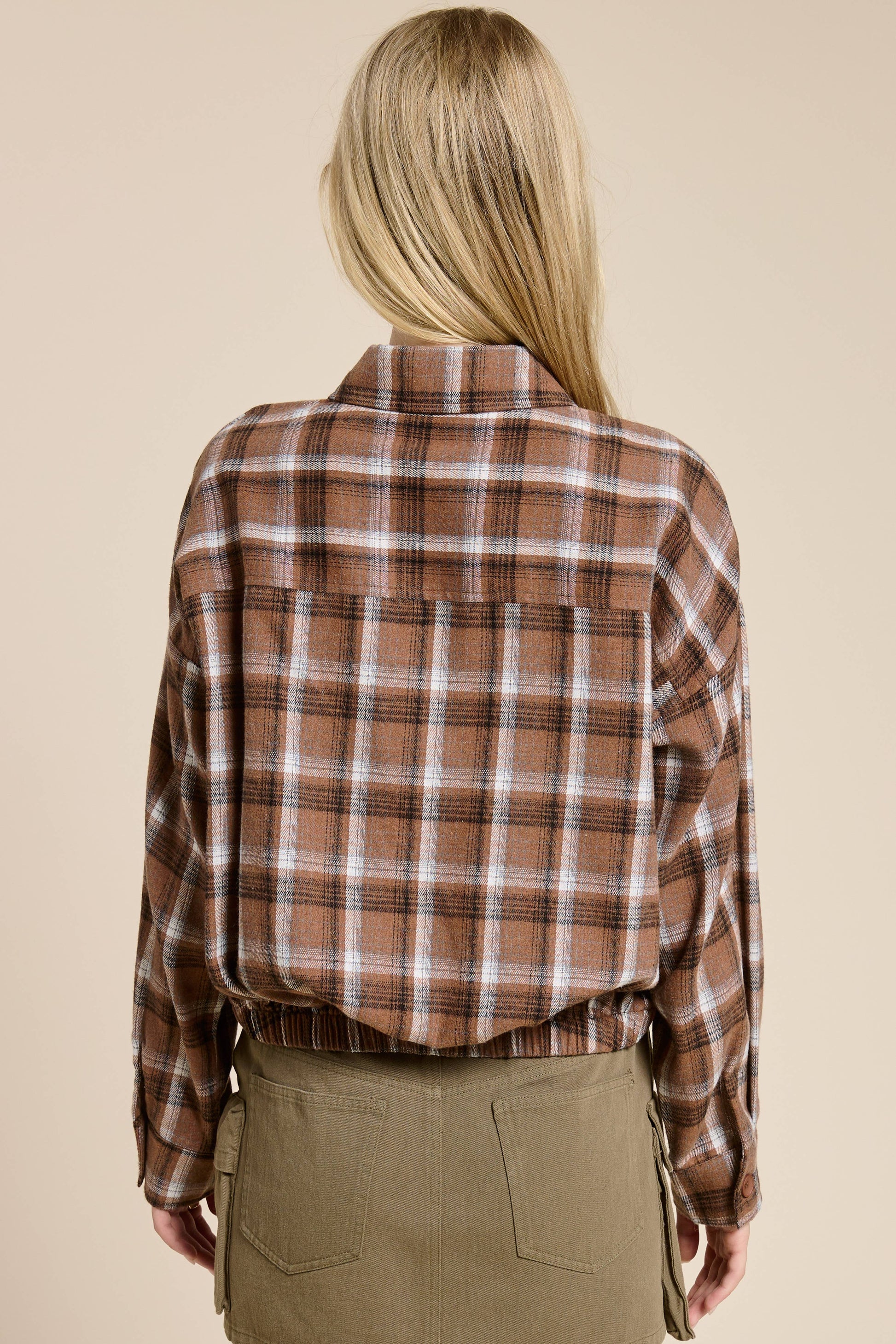A fresh twist on a classic. This cropped flannel shirt features a button-up front, elasticated hem, and a relaxed silhouette with dropped shoulders and a pointed collar. The timeless plaid pattern adds vintage appeal, while the cinched waist gives it a modern edge that's easy to style. Pair with denim, cargos, or corduroy for an effortless fall