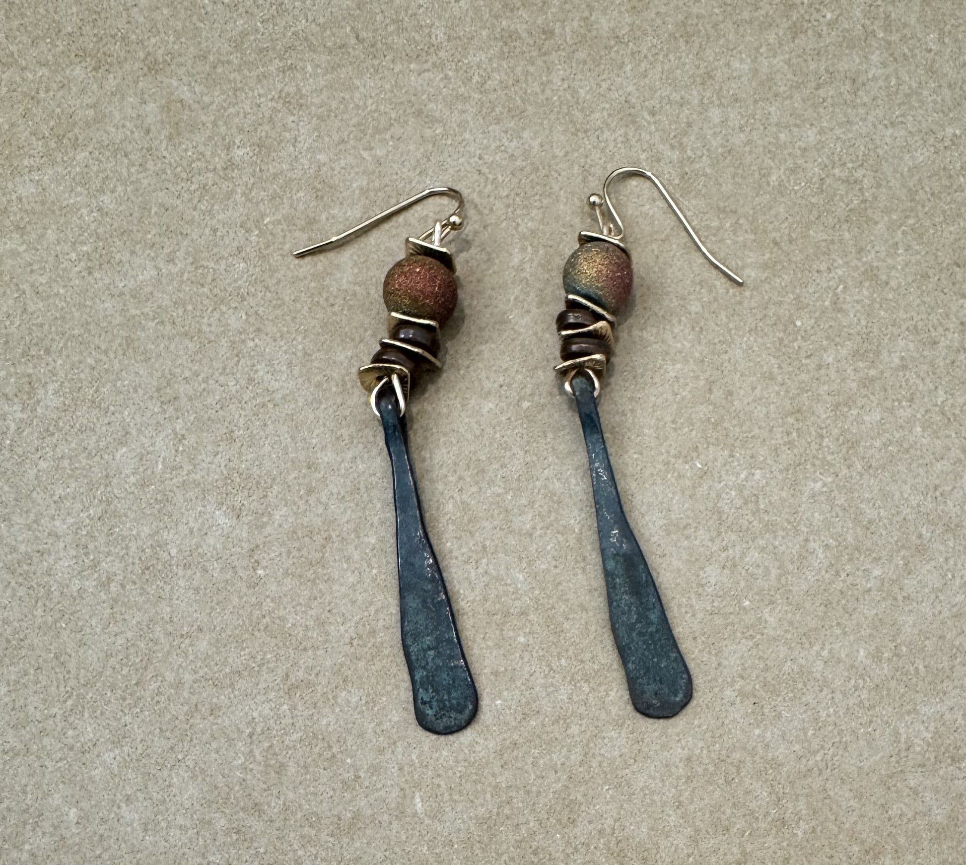 Elevate your earthy elegance with these artisan-forged earrings featuring richly patinated elongated drops, wrapped in warm bronze wire and anchored with hand-textured copper beads. Perfect for lovers of organic textures and vintage tones.