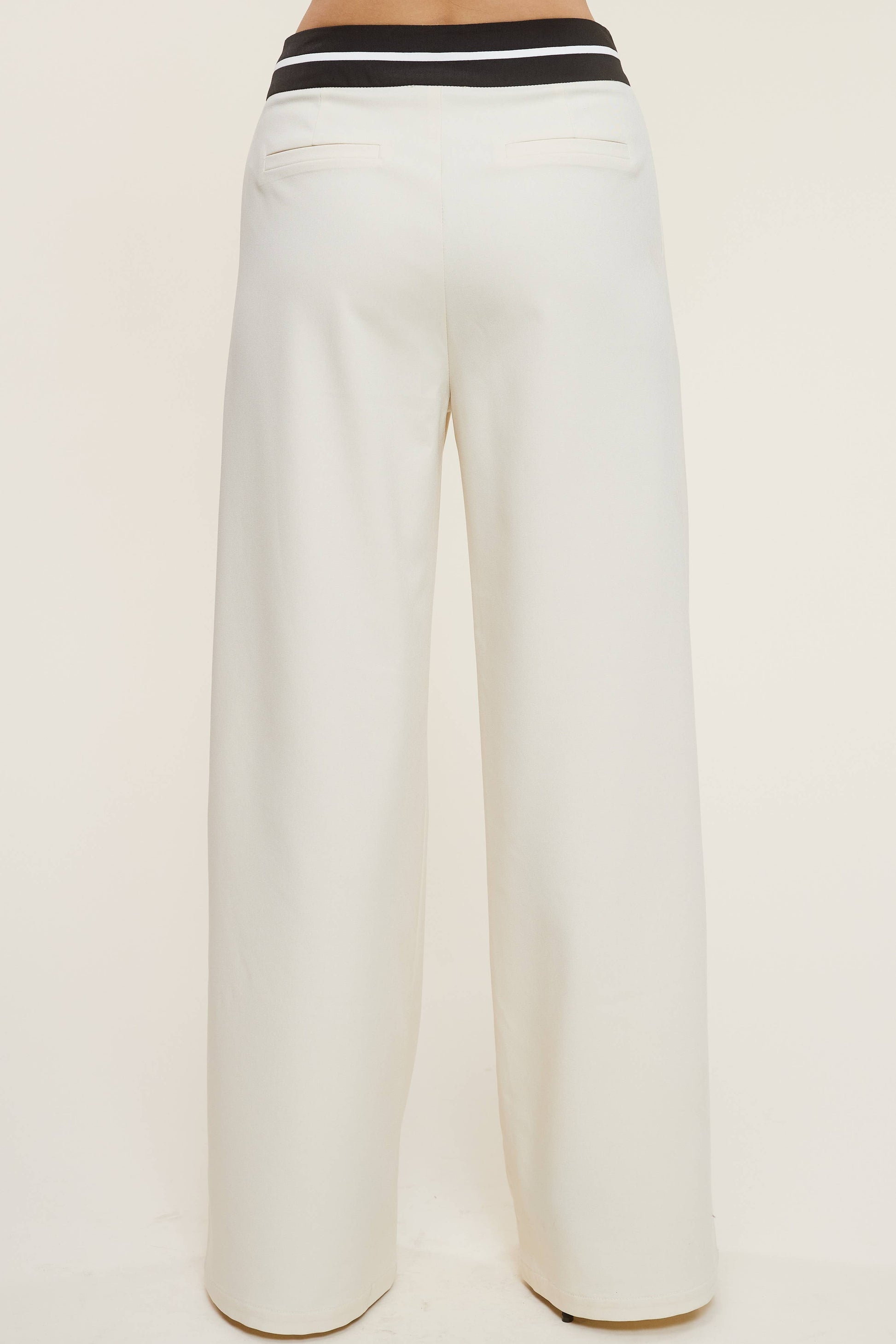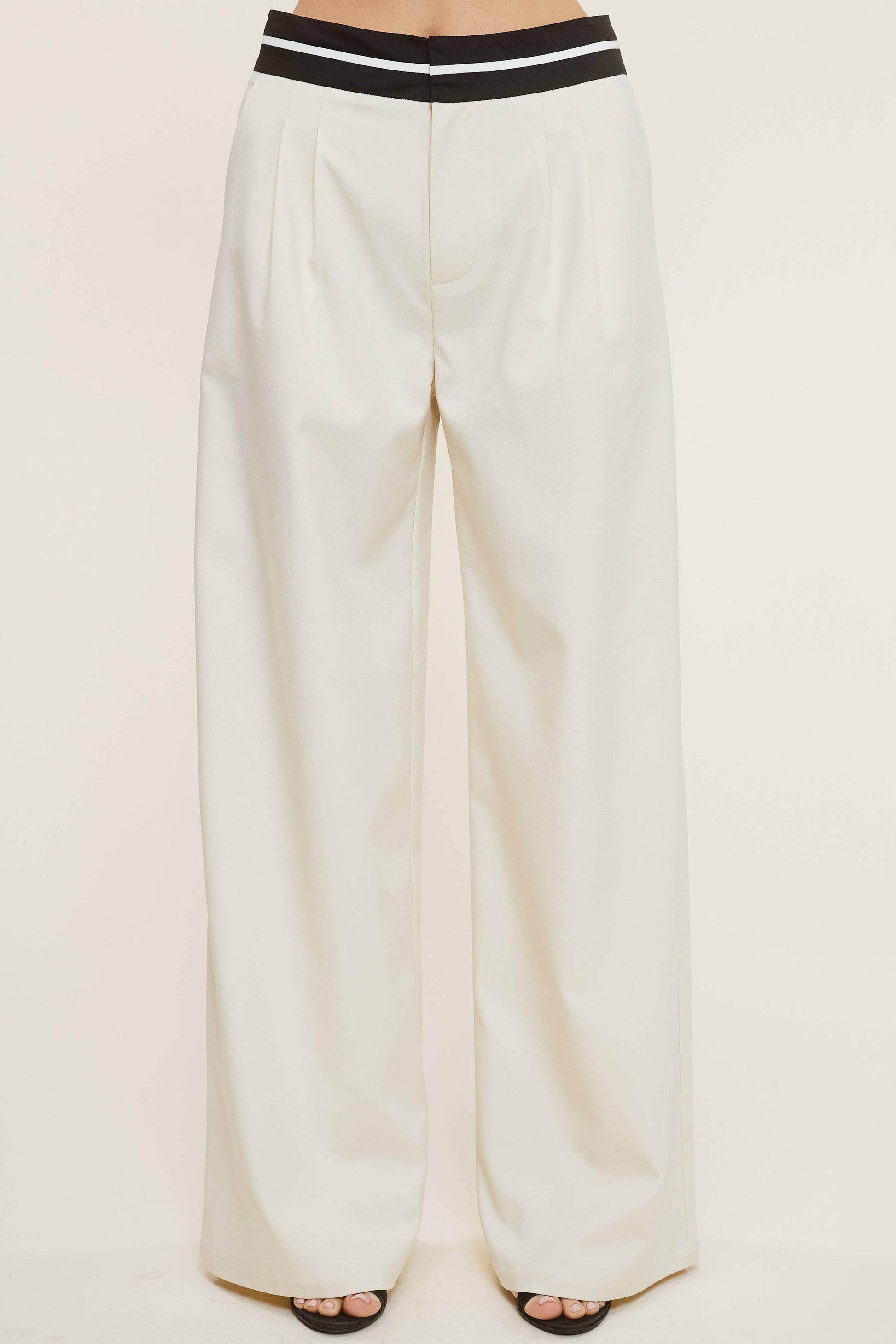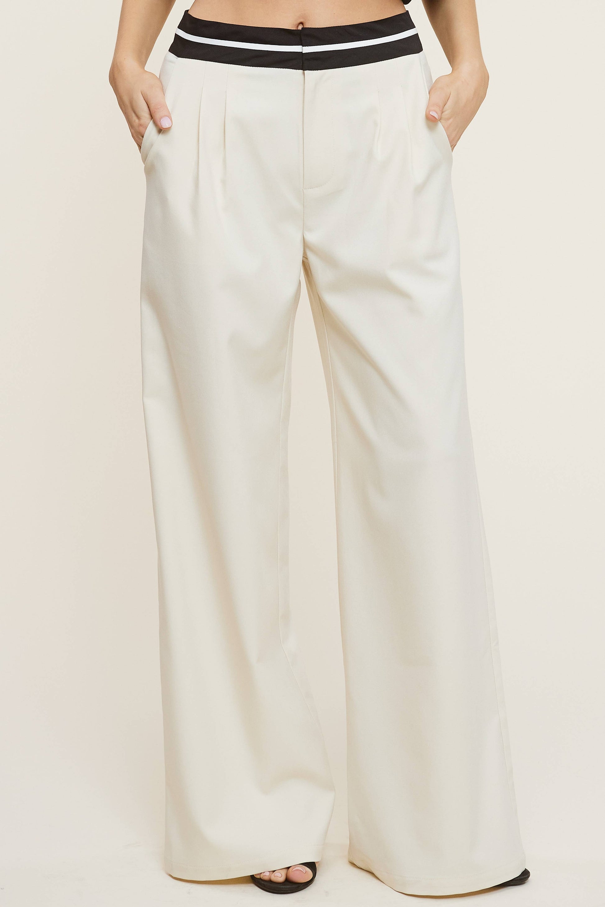 Highlighted by a contrasting striped waistband, functioning front pockets, and a flattering wide leg silhouette, these solid-colored pants bring an element of sophistication to your ensemble. These full-length slacks also showcase pleated front accents, back pocket details, and a mid-rise fit. Drawing inspiration from our bestselling Taurus Trousers, these timeless bottoms effortlessly complement any top, thanks to their neutral and minimalistic appeal.